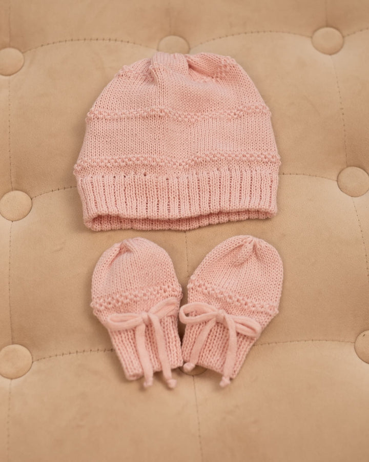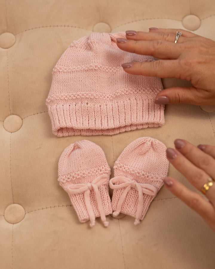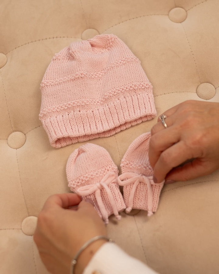 Il Kit Cappellino + Guantini per Neonati Rosa è pensato per coccolare la tua principessa fin dai suoi primi giorni di vita. Un set coordinato che unisce eleganza, comfort e protezione, ideale per completare il corredino o abbinarsi al kit uscita maternità.