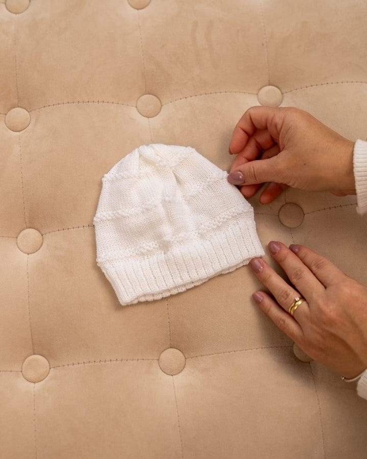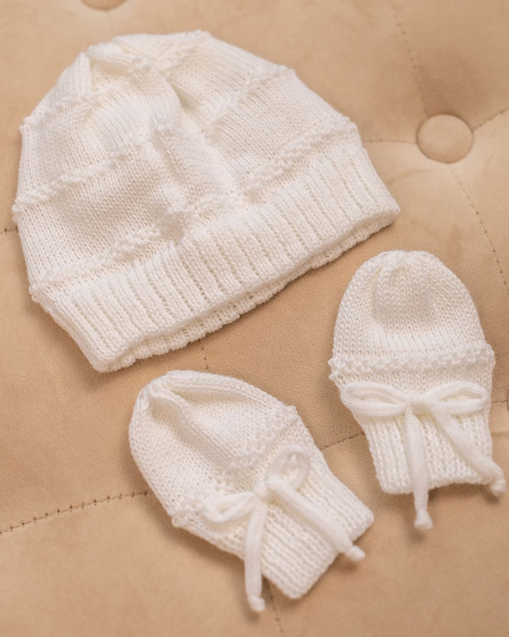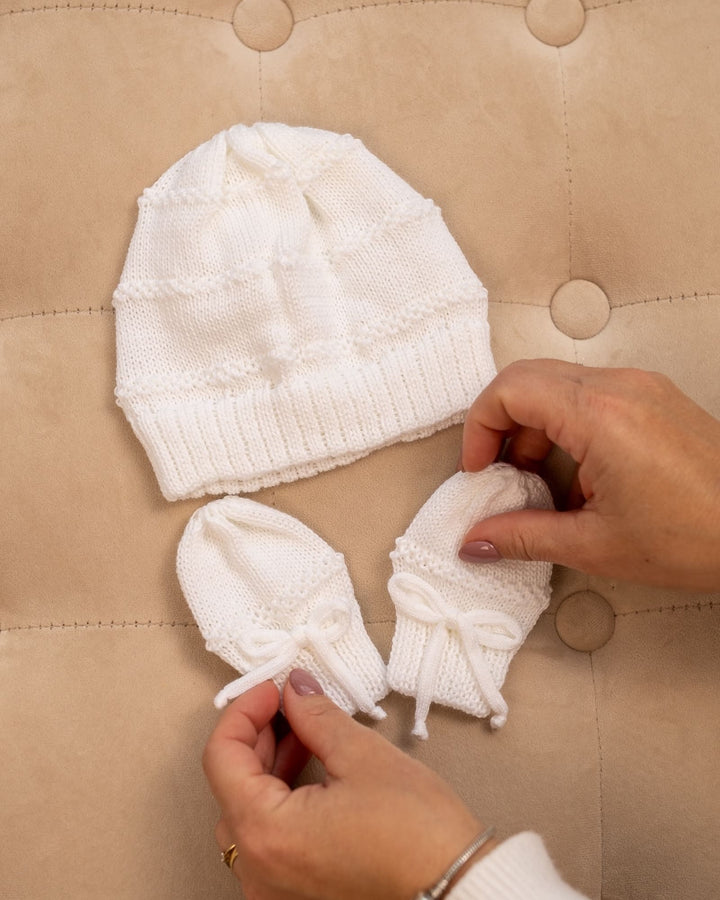 Il Kit Cappellino + Guantini per Neonati Bianco è pensato per coccolare la tua principessa fin dai suoi primi giorni di vita. Un set coordinato che unisce eleganza, comfort e protezione, ideale per completare il corredino o abbinarsi al kit uscita maternità.